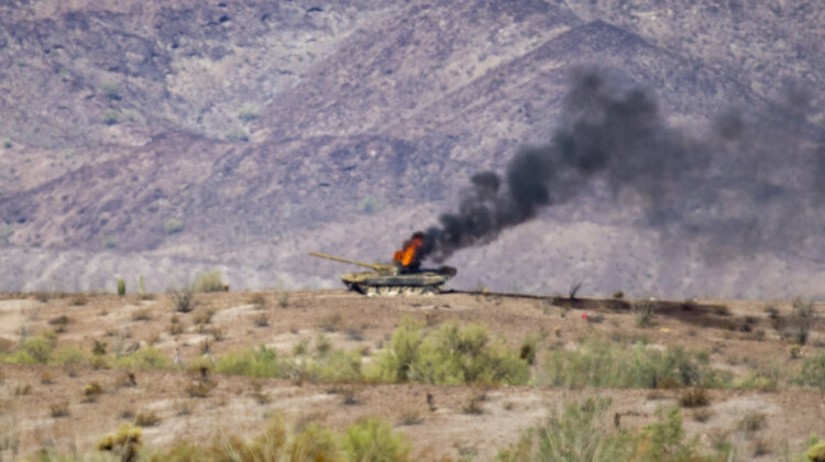 A T-72 main battle tank is set ablaze after impact during a recent Javelin missile system live-fire event. (Image source: US Army)