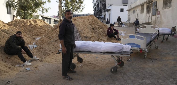 A man stands beside the body of a loved one wrapped in a white shroud as conflict intensifies, leaving devastation in its wake. Image Credit: AP / Abdel Kareem Hana