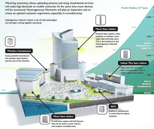 Per Wikipedia, “A HetNet often indicates the use of multiple types of access nodes in a wireless network. A Wide Area Network can use macrocells, picocells, and/or femtocells to offer wireless coverage in an environment with a wide variety of wireless coverage zones, ranging from an open outdoor environment to office buildings, homes, and underground areas. Mobile experts define a HetNet as a network with complex interoperation between macrocell, small cell, and in some cases WiFi network elements used together to provide a mosaic of coverage, with handoff capability between network elements. A study from ARCchart estimates that HetNets will help drive the mobile infrastructure market to account for nearly $57 billion in spending globally by 2017.”