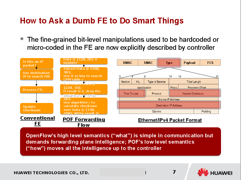 Enter POF. A major chokepoint for SDN is that it requires coding to program new services on the fowarding plane, meaning if you need a tailored solution because your network is unusual, it takes time for a developer to code it. In essence, OpenFlow is cumbersome. Well, Huawei has a solution for that. They call it protocol oblivious forwarding. In essence, it gives a developer or network administrator the ability to manipulate in-transit packets, based on script written in POF, passing through the forwarding plane, in particular, packet headers. Here are some things you can program: statistics, time stamps, and anomaly flow states, data-path instructions that can create and modify flow tables,  MAC learning, active firewall, dynamic load balancing, and controller offloading.