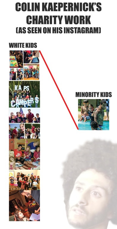 A matter that is not helped when you’re entirely hypocritical, as per Colin Kaepernick’s charity work via his Instagram feed (right). Colin Kaepernick’s Instagram does not reflect that he is passionate about charity work for at-risk minorities.