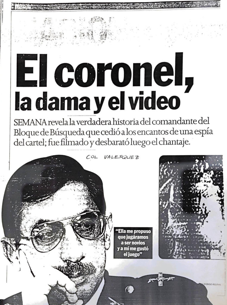The magazine Semana cover: (translation) The Colonel, the woman, and the video. Semana reveals the true story of the commander of the Search Block who gave into the charm of a cartel spy; was filmed and later frustrated by blackmail. “She proposed to me that we play around as lovers, and I like the game.”