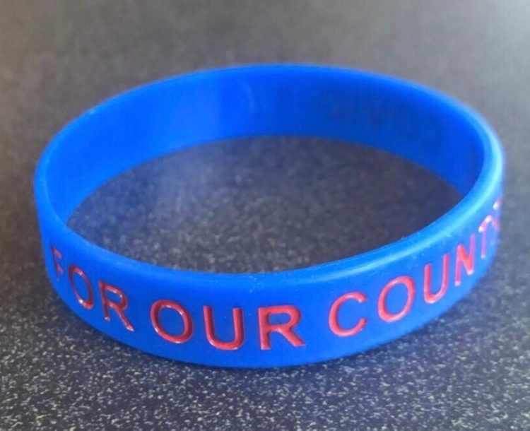 The blue bracelets have the words “For Our Country” written on them.