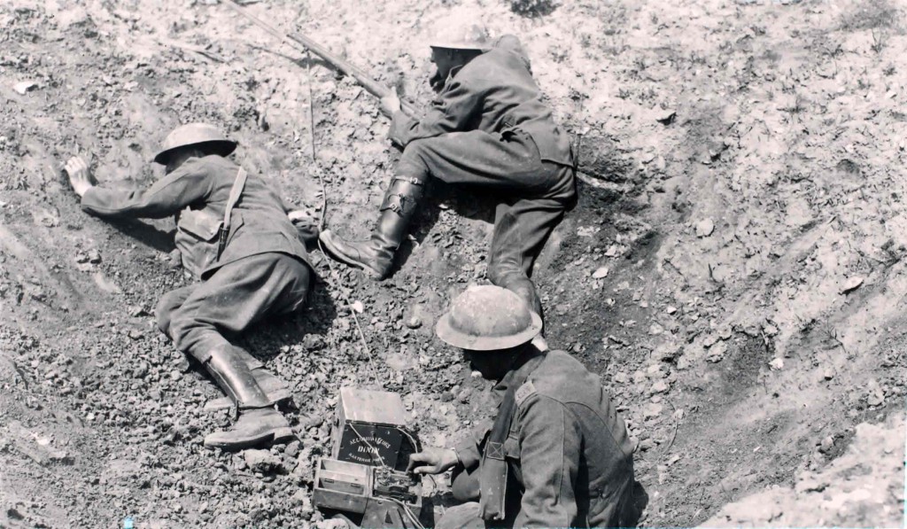 A wireless telegraphic operator using a morse key in a shell hole. (BT Archives cat ref: TCB 417/E 36705) (The National Archives UK)