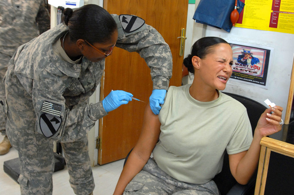 BAGHDAD – Staff Sgt. Renatta Draper (right), from Bemidji, Minn., winces as Sgt. Danielle Dubose, a health care non-commissioned officer, from Detroit, gives her the annual flu shot at the Battalion Aid Station, on Camp Liberty, Oct. 1. All personnel from Division Special Troops Battalion, 1st Cavalry Division receive the annual flu vaccination.