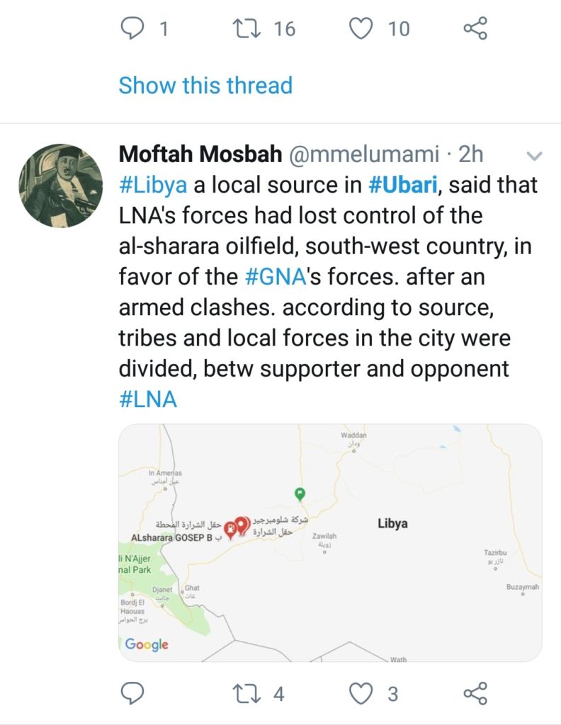 This does not mean that GNA forces will simply lie back and take it. Just a few hours ago locals took to social media to report they have identified 60+ GNA technicals heading toward the oil field in Ubari. Twitter feeds have begun to report confrontations between GNA and LNA forces over control of the field.
