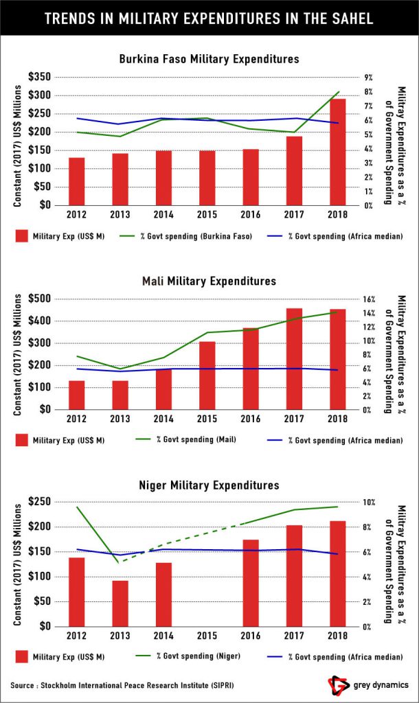 The governments of Mali, Burkina Faso, and Niger have mobilized their security structures to respond to the rise in militant Islamist group violence. The budgets dedicated to the armed forces in the three affected countries have doubled since 2013 (from 5.4 percent of government spending, on average, to 10.6 percent.