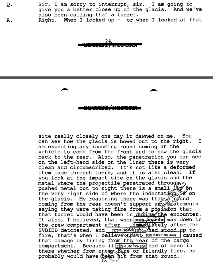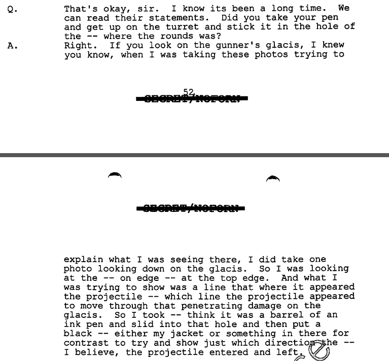 - Question to Pihana that proves he tampered with evidence on vehicle two: “SFC (redacted) said he was looking at photographs after you had examined the vehicles several times with him, that he noticed the damage to the turret had been altered.” Q: On the last day of your time I viewed the vehicle, the damaged part of the turret had been altered so that the damage appeared to have been caused from something from inside of the turret to the outside.”