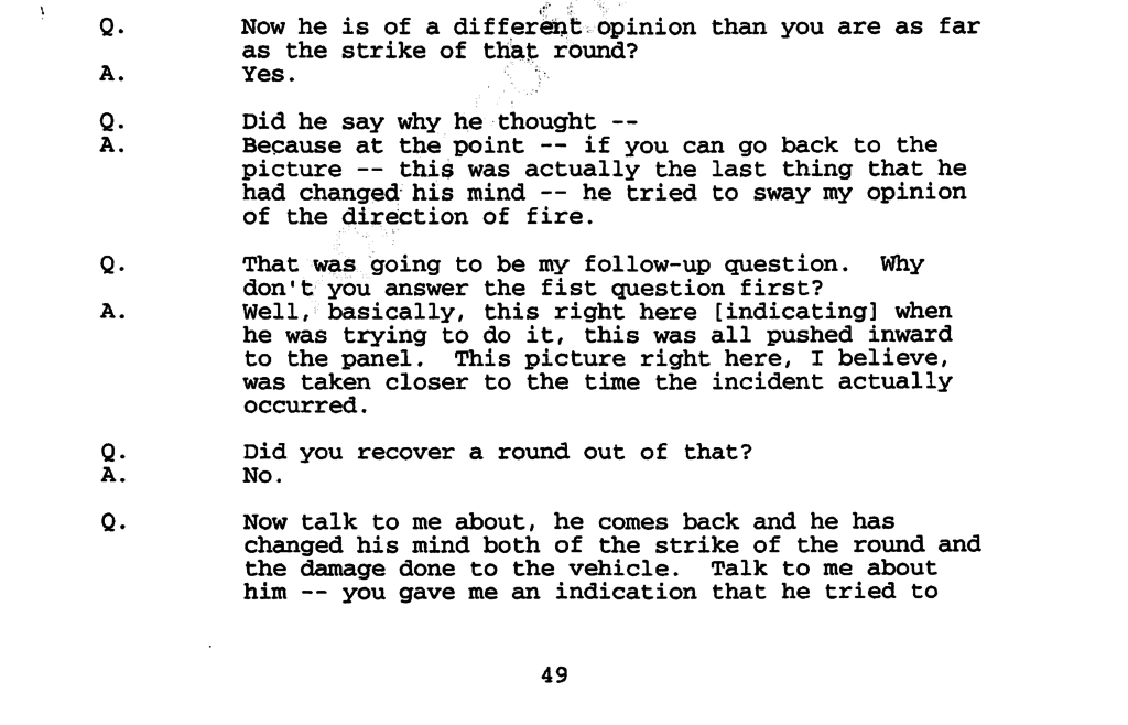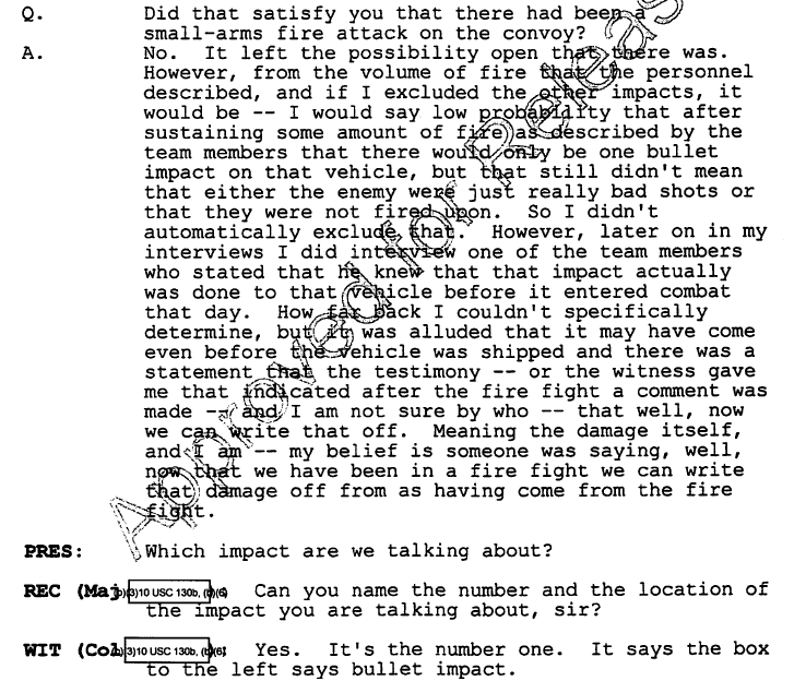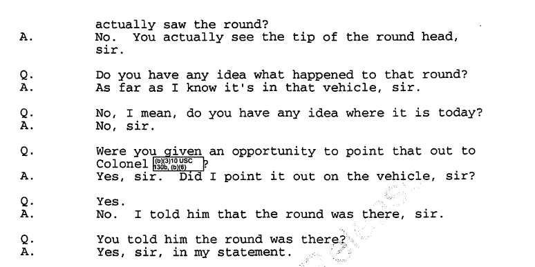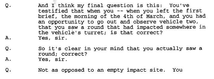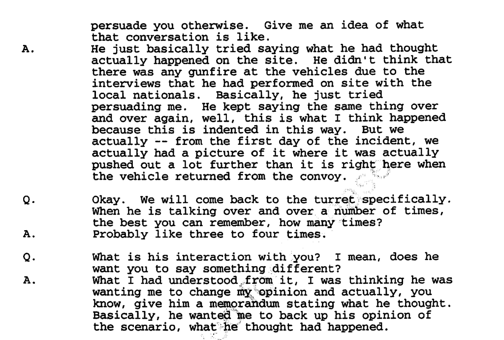 - Q: “What did you hear next?” A: “As the shooting continued, I started hearing the small arms fire. It was, like, you know the single shots was coming. The next I heard bigger shots were fired. And it looked like HMMWV #2 was shooting.”
