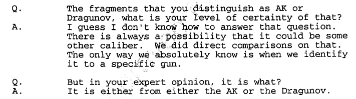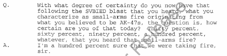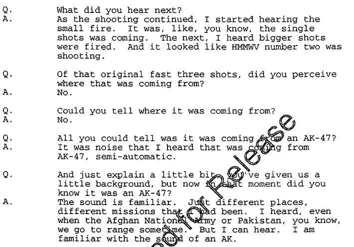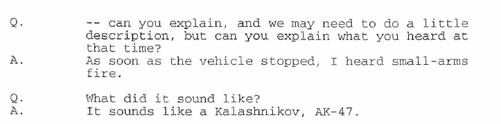 - Q: “Can you explain what you heard at that time?” A: “I heard small arms fire. Q) What did it sound like? A) It sounds like a Kalashnikov, AK-47.”