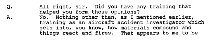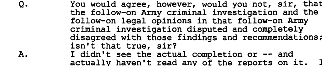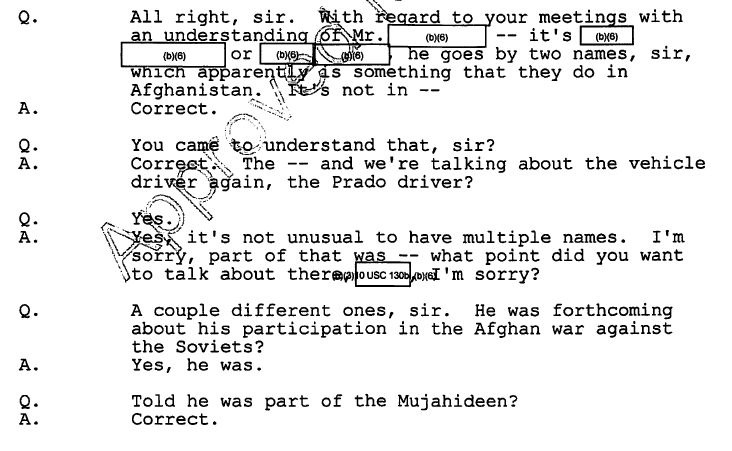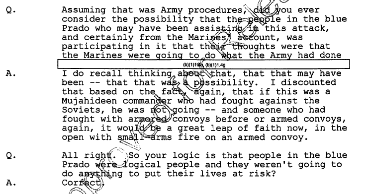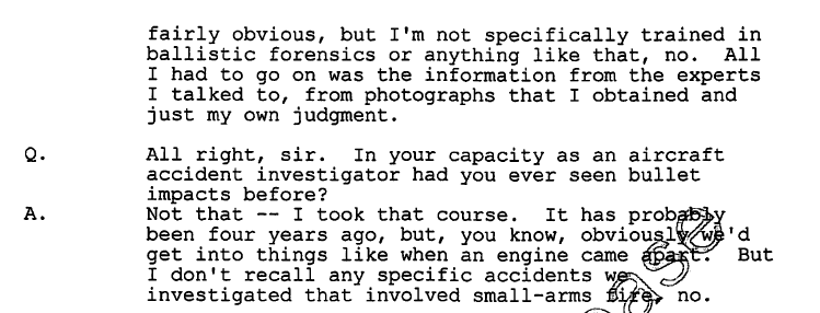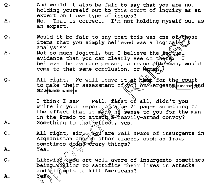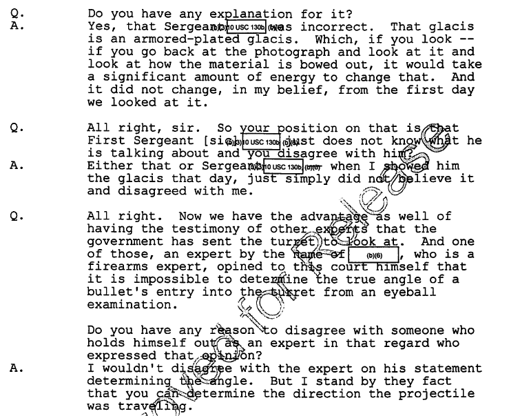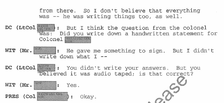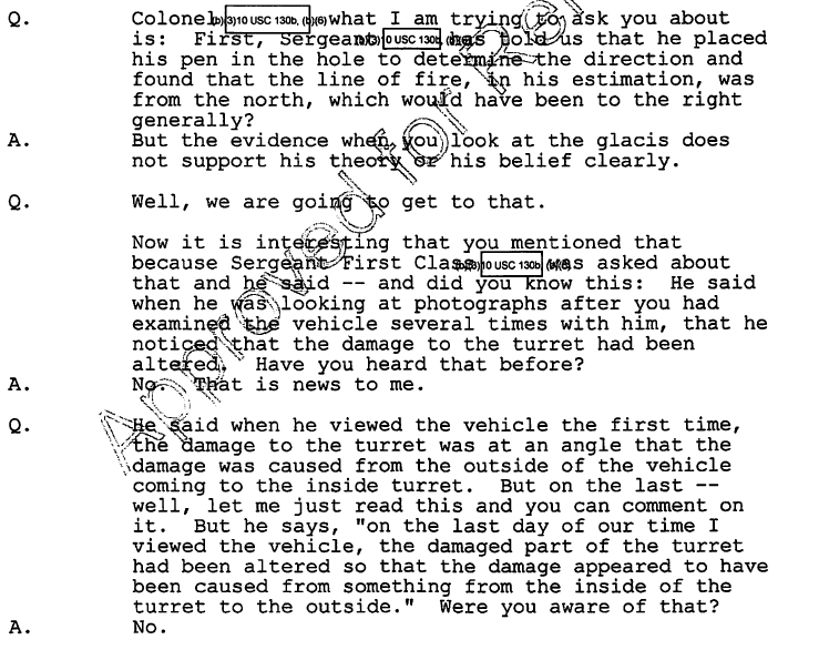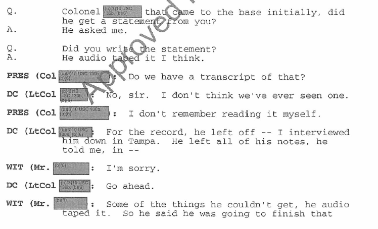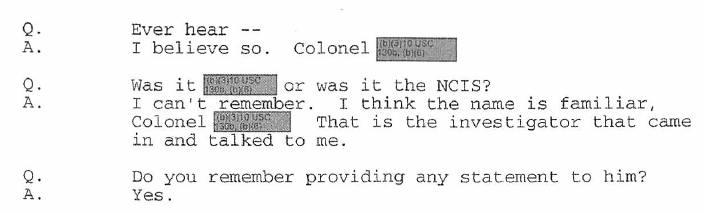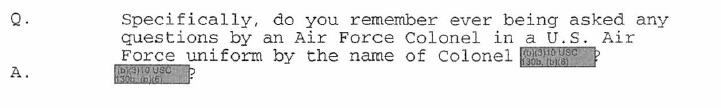 - Q: “Specifically, do you remember ever being asked any questions by an Air Force Colonel by the name of Colonel (redacted)?” A: “I believe so, I think the name is familiar, Colonel (redacted) that is the investigator that came in and talked to me.”