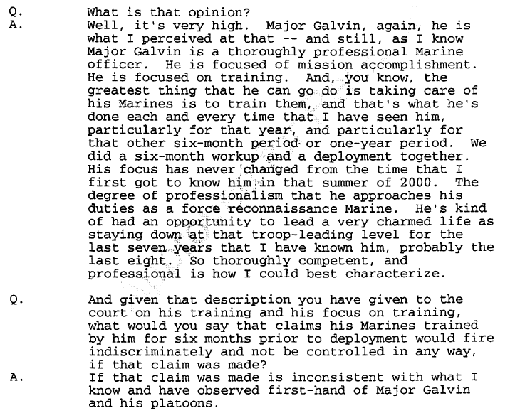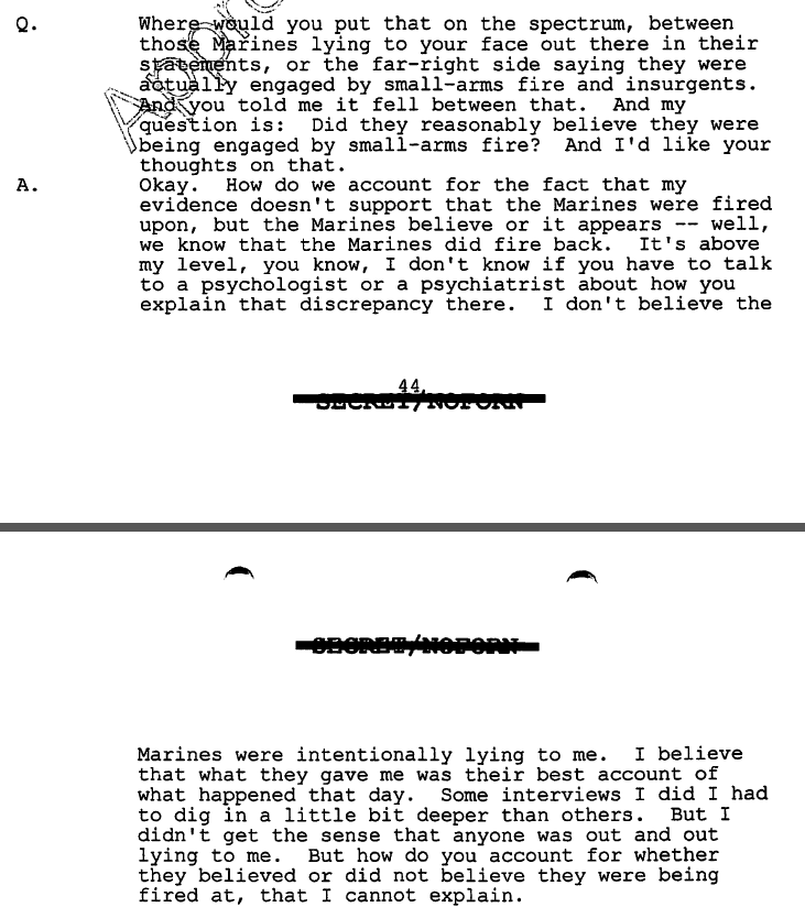 - COI question to Pihana: “How are they trained, what did they understand of the Law of Armed Conflict (LOAC), Law of War (LOW), and rules of engagement (ROE)?” A: “All of the Marines were able to almost repeat back verbatim their training. You could tell they had been, at least in my impression, well trained on how they were supposed to react in those scenarios…so overall impressions were that they knew their jobs well. They knew what they were trained to do.”