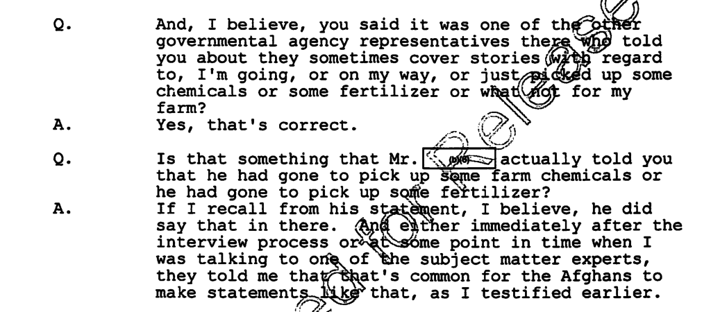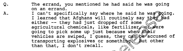- Pihana’s following statement during his sworn testimony indicates he was told by “OGA” in Afghanistan that fertilizer transportation essentially equates to bomb-making. Pihana goes on to state that Haji Liwani told him that he was transporting fertilizer. Pihana again takes the word of a known terrorist over the unanimous testimony of the Marines on the convoy.