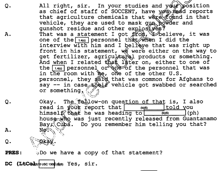 Pihana proved that he did not properly vet the driver of the Prado through any intel reports. The driver stated that he had fertilizer in the vehicle (Pihana already testified that he realized Afghans would state this in order to prevent a swabbing of their vehicle that could result in an explosives reading). The driver told Pihana that he was “heading to the (redacted name) house who was just released from Guantanamo Bay’s prison.”—NCIS Investigation Vol 3, Binder 1, pg 16.