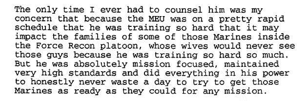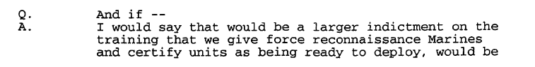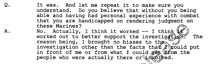As covered in part two of this series, LTG Kearney spoke of how the Marines were not ready for “prime time,” yet he selected an officer (Pihana) to investigate capital offense cases despite his openly admitting to having no combat experience. Pihana was certainly not ready for prime time. To further validate the caliber of Marines who comprised Fox Company, Colonel Petronzio’s testimony from the COI stands in stark contrast to Kearney’s assessment of those men. Furthermore, Kearney himself had not seen combat actions firsthand since a very brief moment in Panama many years prior, while Petronzio had just returned from high-intensity combat in Iraq, and was preparing to go back for more in Afghanistan.