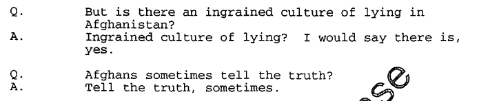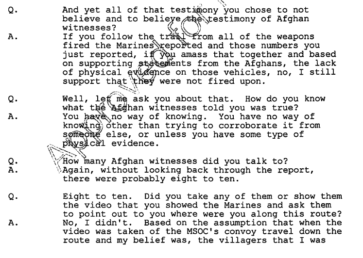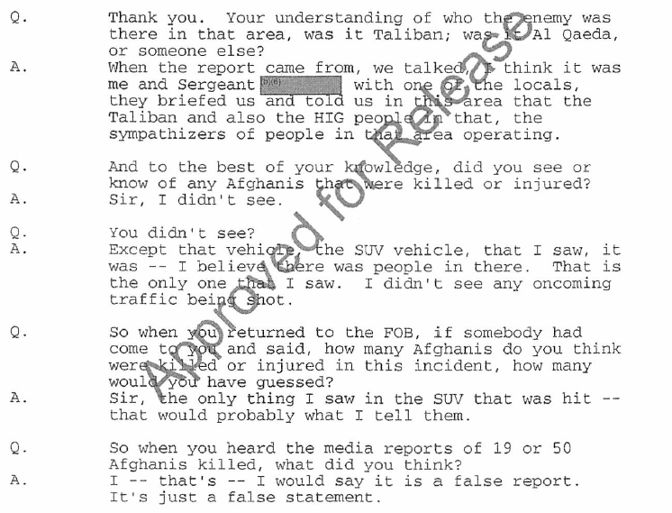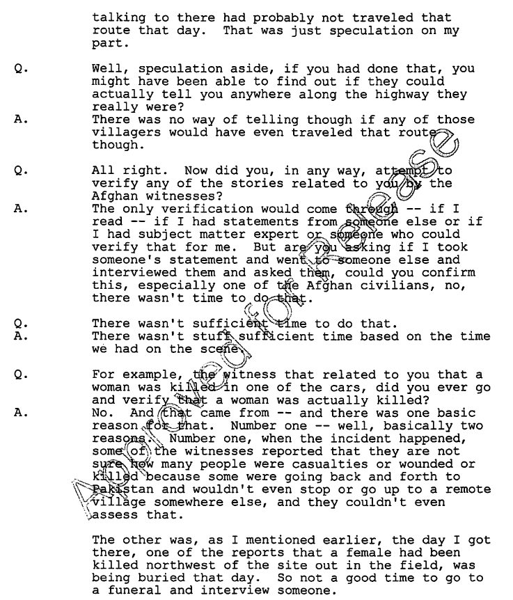 - Q: “So when you hear the media reports of 19 or 50 Afghans killed, what did you think?” A: “I would say it’s a false report. It is just a false statement.”