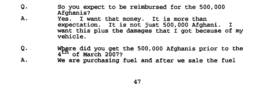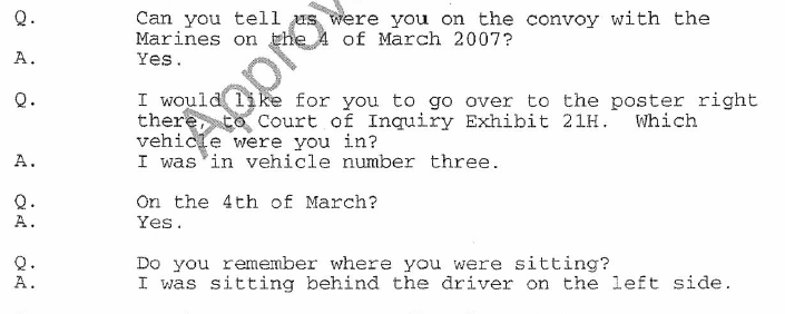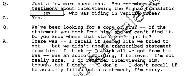 Below are questions from the court of inquiry to the Afghan interpreter for MSOC Fox who was on the 4 March, 2007 patrol, which confirm several things: The interpreter was indeed born and raised in Afghanistan, he was, in fact, sitting in the third vehicle on March 4th, and he was 100 percent certain the sound of the rounds fired at the Marines were from small arms (AK-47s).