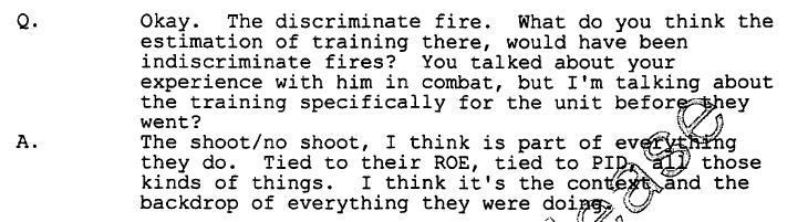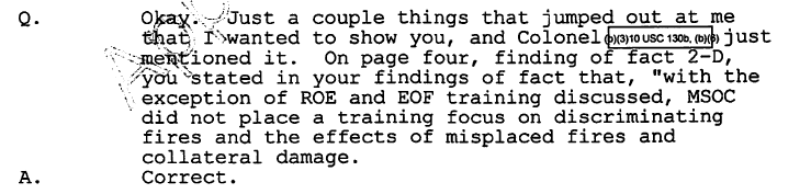 - Q: “With the exception of ROE and EOF training discussed, MSOC did not place a training focus on discriminating fires and the effects of misplaced fires and collateral damage. A: (Pihana) “Correct.”