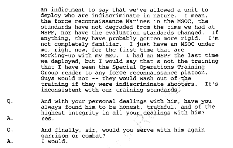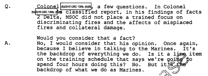 - Question from the panel to Col. Petronzio about Pihana’s finding of fact that MSOC Fox did “not place a training focus on discriminating fires and collateral damage.” A: “No, I would consider that his opinion.”