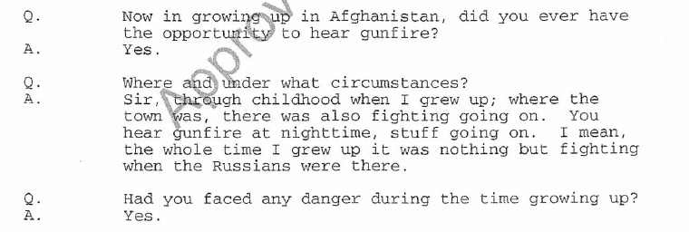 Q: “Now growing up in Afghanistan, did you ever have the opportunity to hear gunfire?” A: “Yes.”
