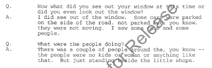 Q: “What were the people doing?” A: “The people were no kids or women or anything like that.”
