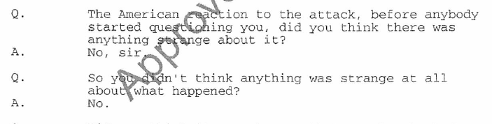 - Q: “The American reaction to the attack…did you think there was anything strange about it?” A: “No, sir.”