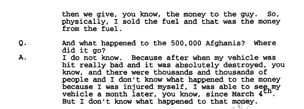- Pihana was not aware that the driver of the blue Prado SUV survived, since that driver was shown in the international media as being heavily engaged by Marine rifle rounds. The driver claimed during his COI testimony—from an American base—that he had 500,000 in Afghan currency in his glove compartment (equivalent to 20 years of the average Afghan salary). He expected the U.S. to repay him for the loss of the money and the damage to his vehicle. He also stated in the same testimony that he was on his way that morning to purchase fuel, and that he had fertilizer in his car. Pihana failed to connect the dots that the driver, a self-proclaimed mujahid with the name of “commander” (Qommandan), was well financed, transporting the two primary ingredients for making a large explosive device, and who claimed he was on his way to see a man recently released from Guantanamo Bay. The man’s original testimony to NCIS of having three relatives killed in his SUV that day was later changed on the witness stand to two relatives killed in his SUV. However, Pihana totally accepted the word of this tribal leader at face value and did not believe the unanimous testimonies of the Marines and corpsmen on the patrol.