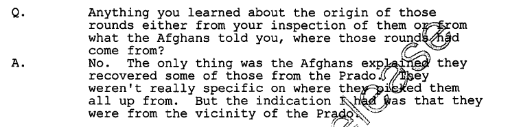 - Captain Clancy (USN SJA assisting Lt. Gen. Yarmand’s Afghan investigation) states that Lt. Gen. Yarmand mentioned “the brass casings found inside the Prado.”
