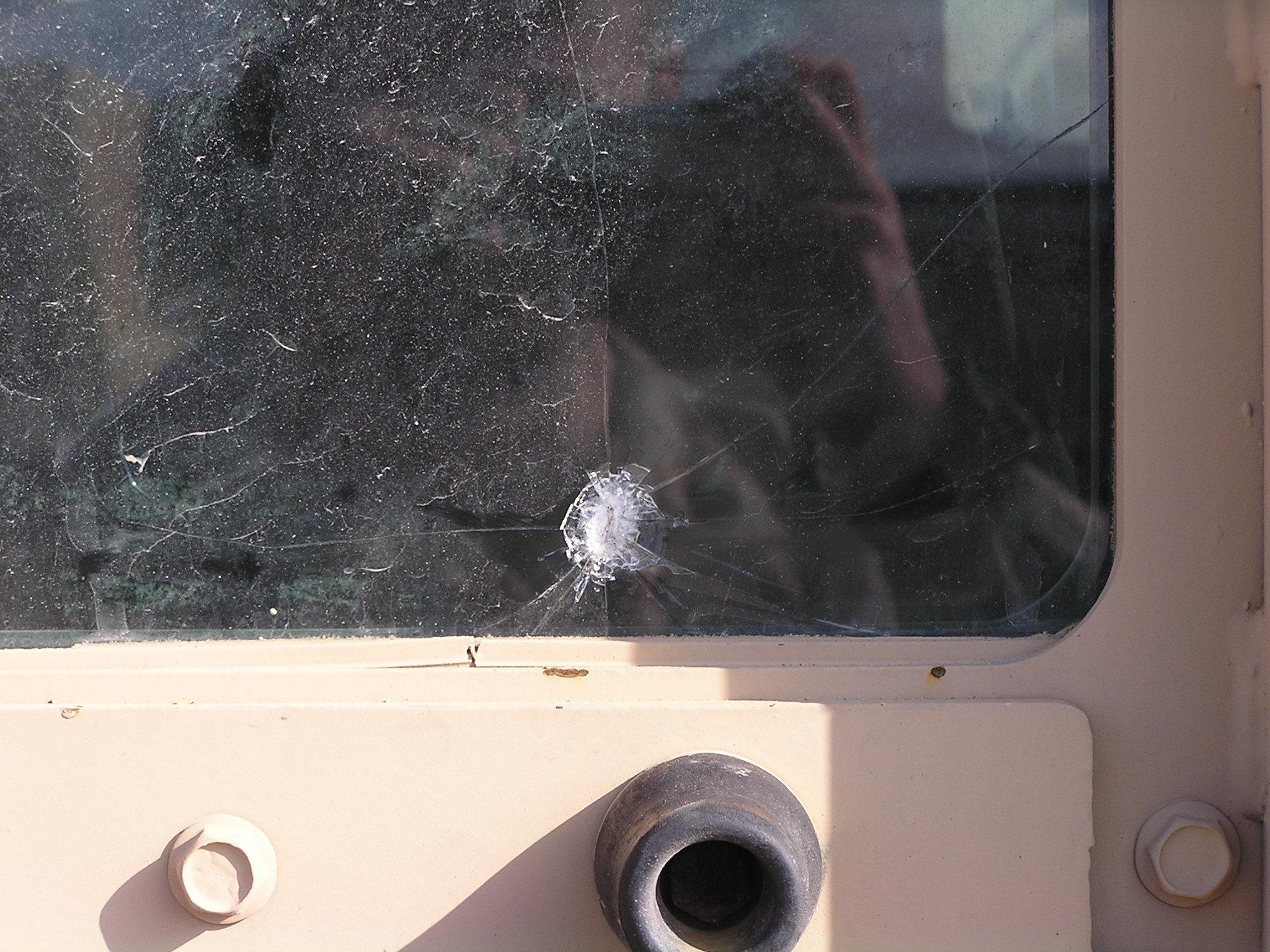 - The testimony of a United States Army Criminal Investigative Laboratory subject matter expert, during the 2008 COI, stated on six separate occasions during his sworn 2008 courtroom testimony that the damage to the window of vehicle two (images below) resulted from a round fired from either an AK or a Dragunov sniper rifle. Pihana opined the bullet impact occurred prior to the patrol leaving on 4 March, 2007. Again, Fox Company had not been issued any ammunition for either an AK or a Dragunov.
