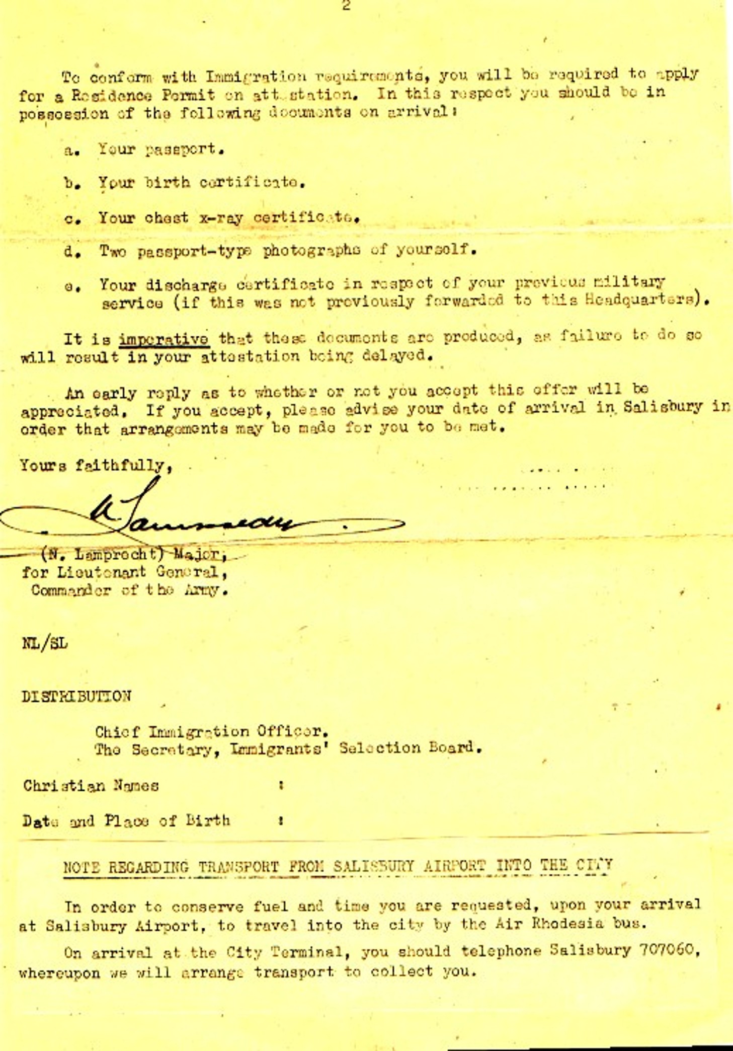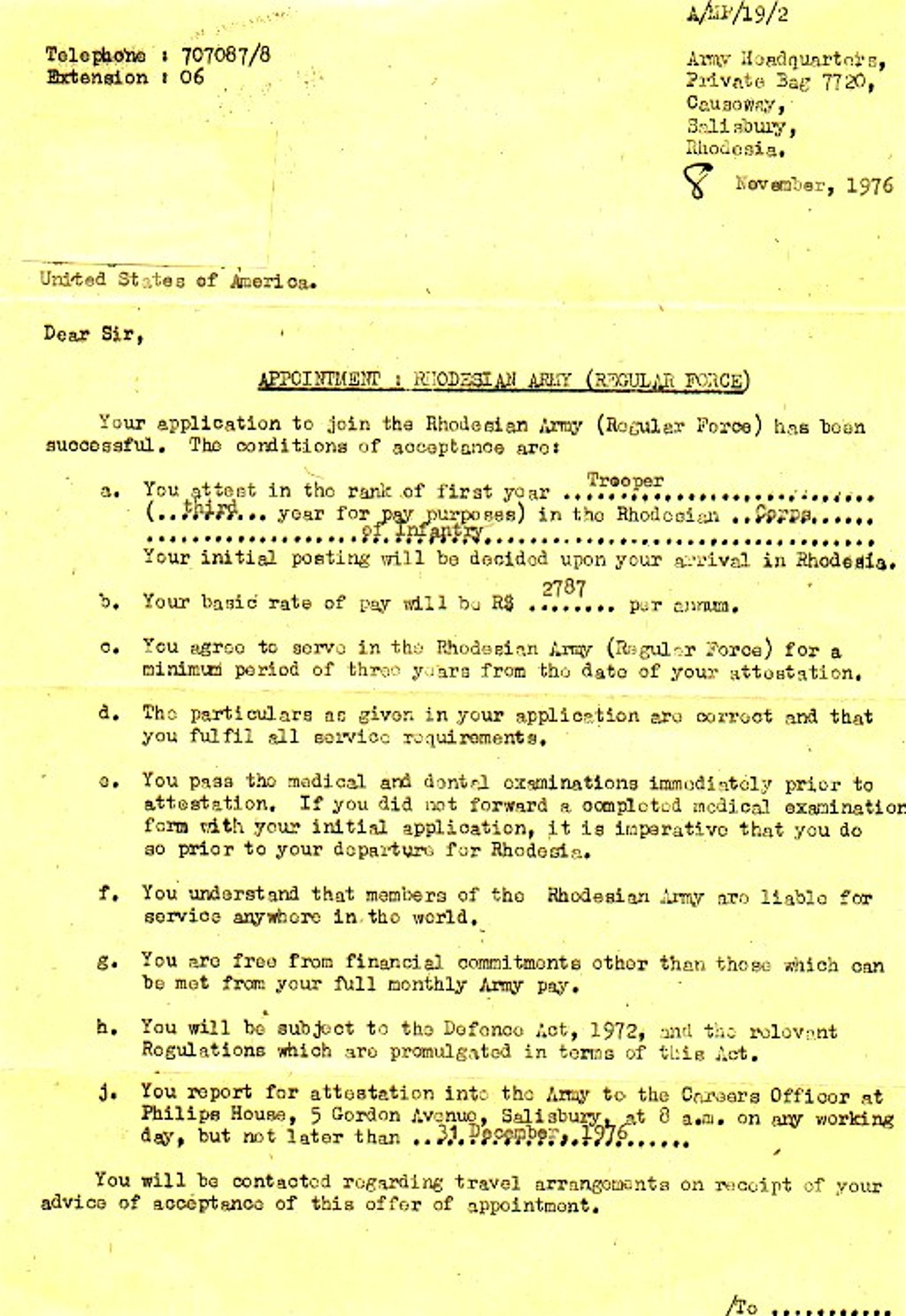 The Rhodesian Army had its own Major running their foreign volunteer office, Nick Lamprecht, who was far more rational. He had subordinates screen out the rubbish and he would look at the quality submissions himself. You made the cut and he’d send you a conditional acceptance offer.