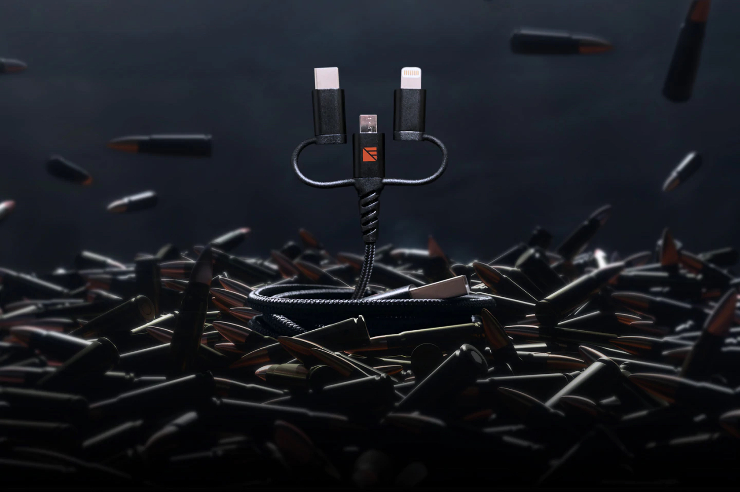 The item I’d like to alert you all, too, though, is the survivor charging cable. The Survivor Cable is a charging cable that is fully encompassed by paracord—either orange or black—and is incredibly robust. The Survivor Cable boasts the following hardening features: