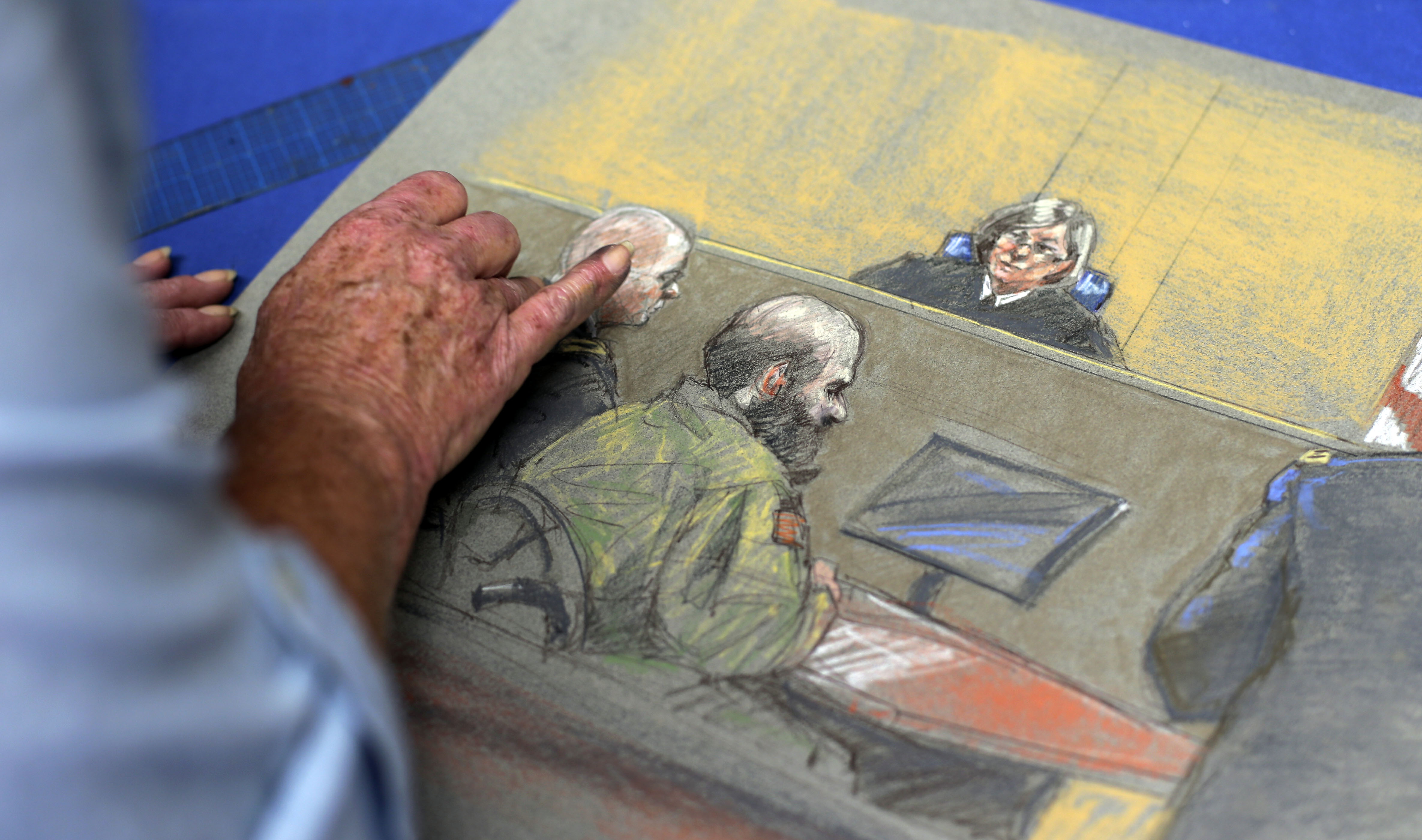 Artist Brigitte Woosley works on a sketch showing Maj. Nidal Hasan in court before the judge, U.S. Army Col. Tara Osborn, during the sentencing phase of his trial, Monday, Aug. 26, 2013, in Fort Hood, Texas. The jury found Hasan unanimously guilty on the 13 charges of premeditated murder and has since been sentenced to death. | AP Photo/Eric Gay
