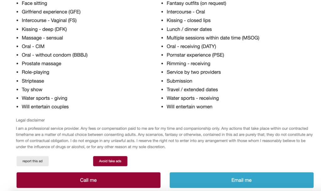 The representative site above was the only info I was given, along with a request to find the pimp! That may seem rather difficult — but at face value only. There had to be a way to contact the victim of this trafficking event and to make an appointment with (in this case) her on that page somewhere. And as anticipated, I found the options at the bottom of the page.