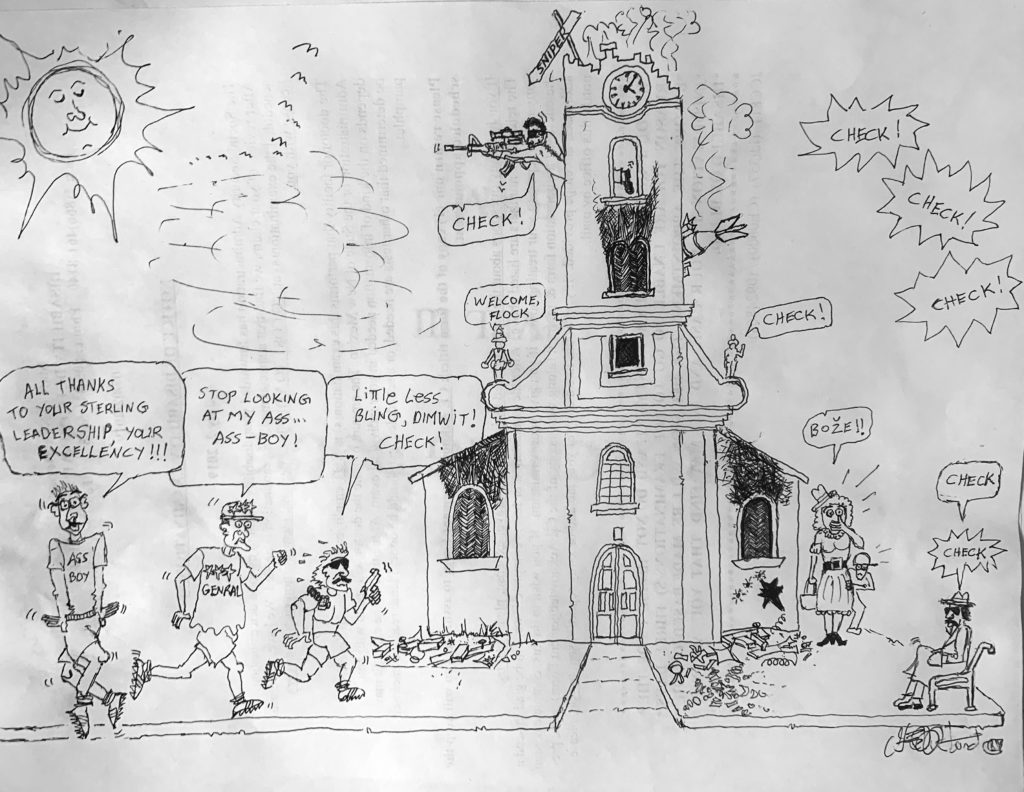 “Yeah, I know it; it’s the one we have been calling ‘The Church of Saint Dimwit — ha, ha, we call it that because…’”