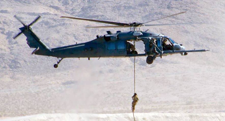As the helos made their short final approach to the landing zone, shouts were heard that there were obstacles on the LZ and we would have to fast rope to the ground. I reached for my leather gloves attached high on the left side of my chest, but there were none. I made some frantic sweeps with my hands to find them… nothing. Rotor wash from the descending helo had blown them over my shoulder where they hung down my back. I would have to rope in with just my thin flight gloves. I contemplated my quicky saw with disdain.