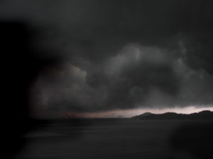 I turned back to where I thought I knew the boat to be but saw nothing. I felt a distinct thump in the pit of my gut. Another harsh clash of éclair fiercely lit the panorama, and I thankfully saw the hull of the boat once again. I crawled my way back and was promptly snatched back out of the drink by my stalwarts and trusty First Mate.