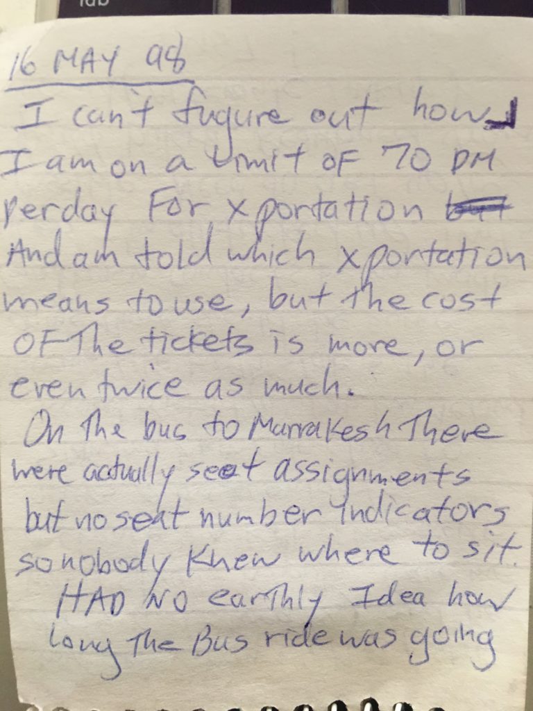 The boys and I stood around swilling our mint tea and huffing camel dropping cigarettes. We were kings, if only just for seven minutes! I was breaking one of my own cardinal rules: don’t make friends in your own backyard because then you are stuck with them when/where you don’t want them. Yeah, now all these guys will want to be my friends, and I’m stuck on a bus with them but don’t want to be their friend. That had been a simple no-shitter, and I screwed it up!