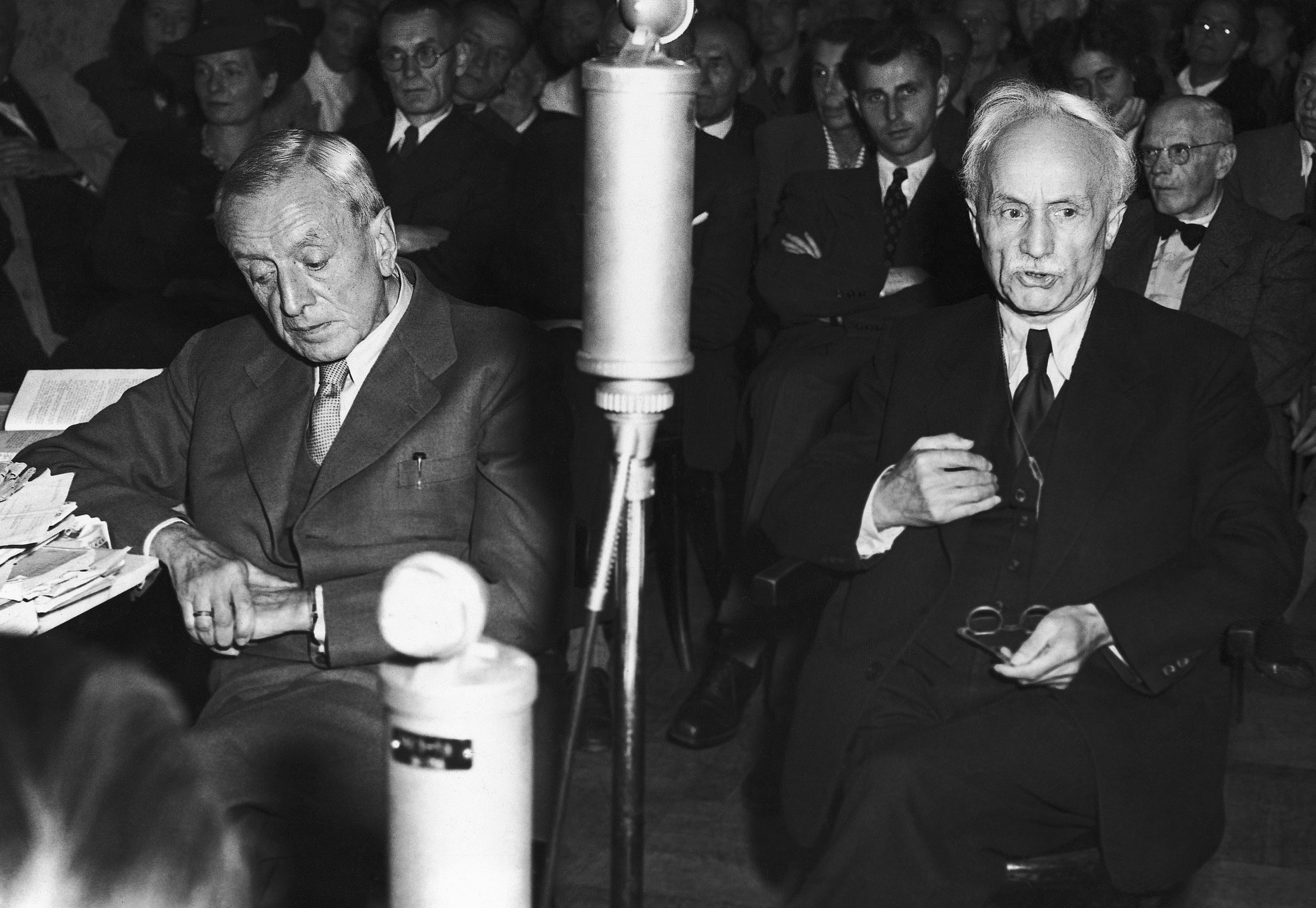 On August 16, 1948, denazification proceedings (Spruchkammerverfahren) began against the industrialist Dr. h.c. Fritz Thyssen, left, showing him on August 30, 1948 during the trial in Koenigstein /Taunus, Germany, seated next to witness for the prosecution, former Prussian Minister of the Interior Dr. Carl Severing. | AP Photo/Hanns J. Jaeger