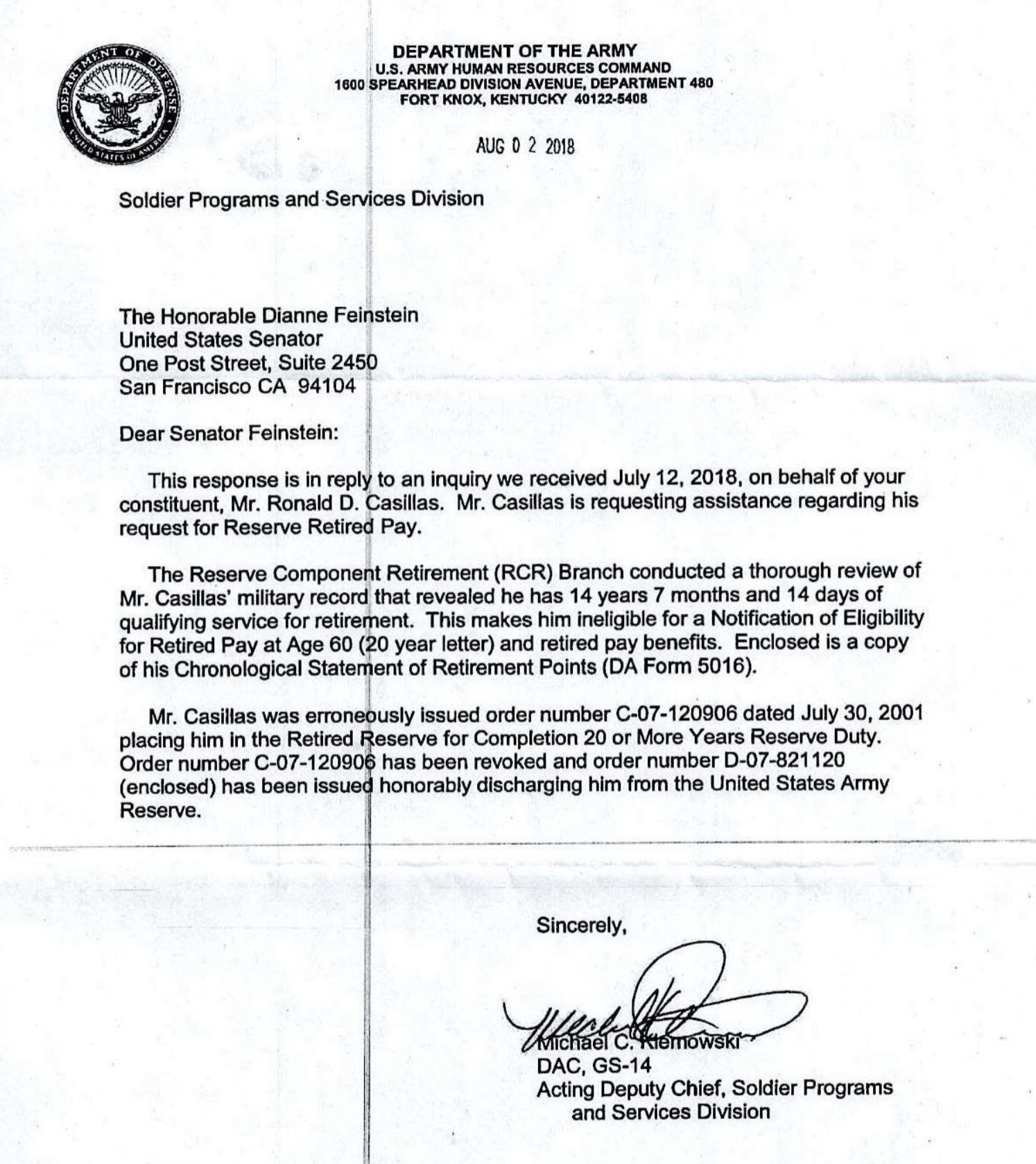 At this point, Casillas wrote to his Senator back home, Dianne Feinstein. Senator Feinstein followed up on his letter with the Department of the Army who determined that Ron’s retirement orders had been erroneously issued. Their response was to “fix the glitch” on their computer system and cut a new set of orders which discharged Ron from the retired reserve and ordered him to return his retiree identification card to Fort Knox.
