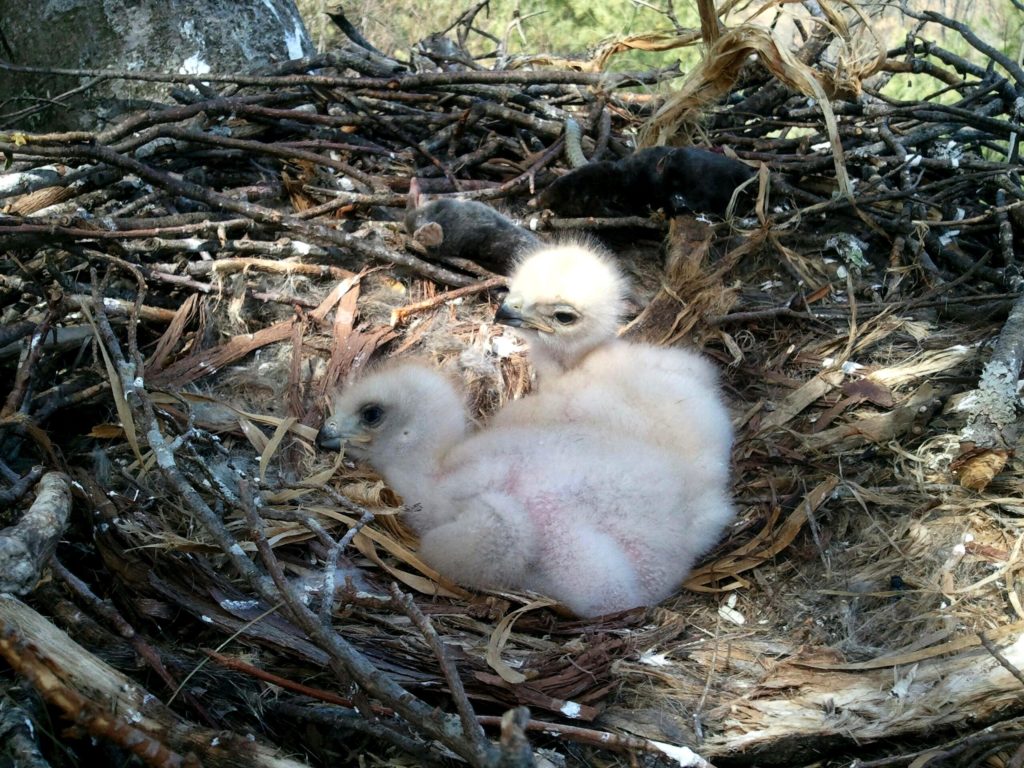 So Nelly is run down to 45 MPH going east now. I am counting poles and craning my neck to see fuzzy white. And I see it finally. There, at some 100 meters from the roadside is a lone telephone pole. In the cross timbers of the top, is a pile of sticks and twigs that formed a bowl. From the top of the bowl of branches are two white fuzzy heads. I cruised up closer and reveled in the spectacle that was two baby Red-Tailed hawk chicks, just days old, and yet already so big and fuzzy-white.