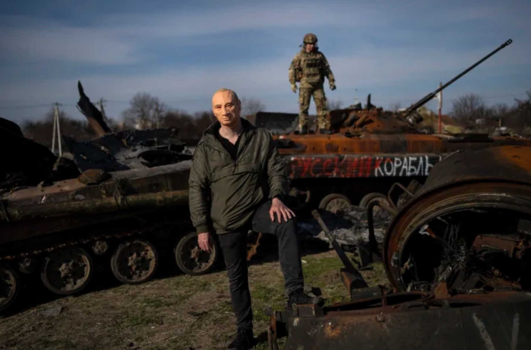 A man wearing a Vladimir Putin mask poses for a picture in front of the ruins of a Russian tank near Bucha. Image Credit: amp.brisbanetimes.com.au/AP