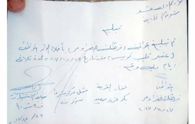 In the village of Palkana, it was reported that the Iraqi forces had given residents three days to evacuate their homes permanently in order for resettlement by Arab communities. Prior to that a letter, appearing to be signed and produced by the Governor of Kirkuk on official letterhead, authorizing the eviction of Kurdish citizens from their Kirkuk homes went into circulation.