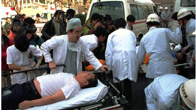 Emergency workers coming to the aid of people wounded in the 1995 Tokyo Gas Attack