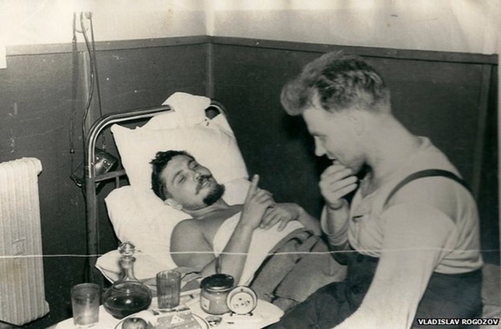 Leonid Rogozov lying down talking to his friend Yuri Vereschagin at Novolazarevskaya. (Vladislav Rogozov/BBC)