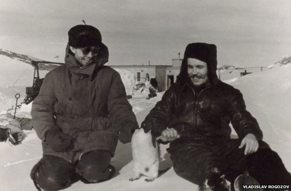 Leonid Rogozov (R) relaxing with one of Antarctica’s best-known inhabitants. (Vladislav Rogozov/BBC)