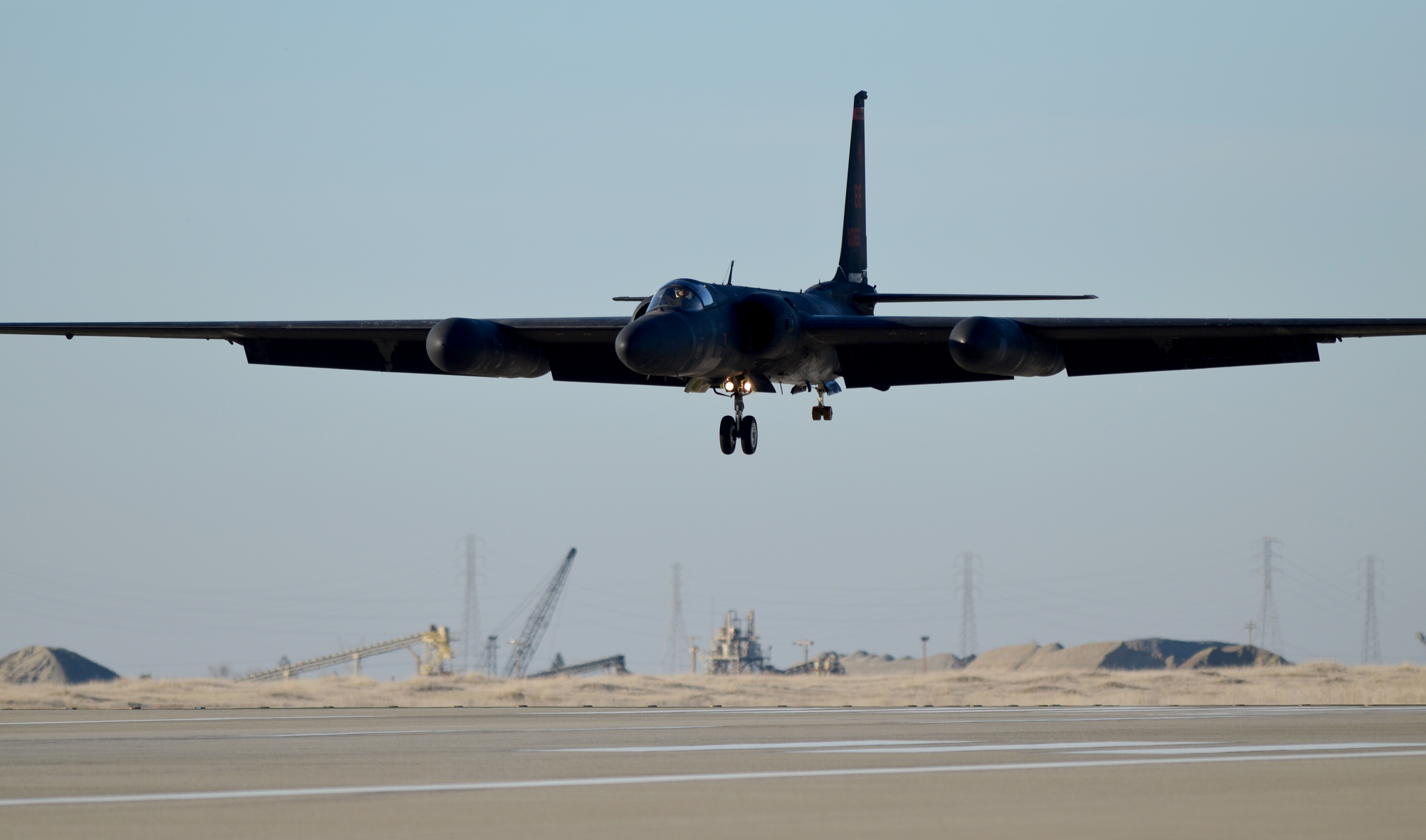 A U-2 Dragon Lady soars above the flightline at Beale Air Force Base, Calif., Jan. 22, 2014. The low-altitude handling characteristics of the aircraft and bicycle-type landing gear require precise control during landing. (U.S. Air Force photo by Airman 1st Class Bobby Cummings/Released)