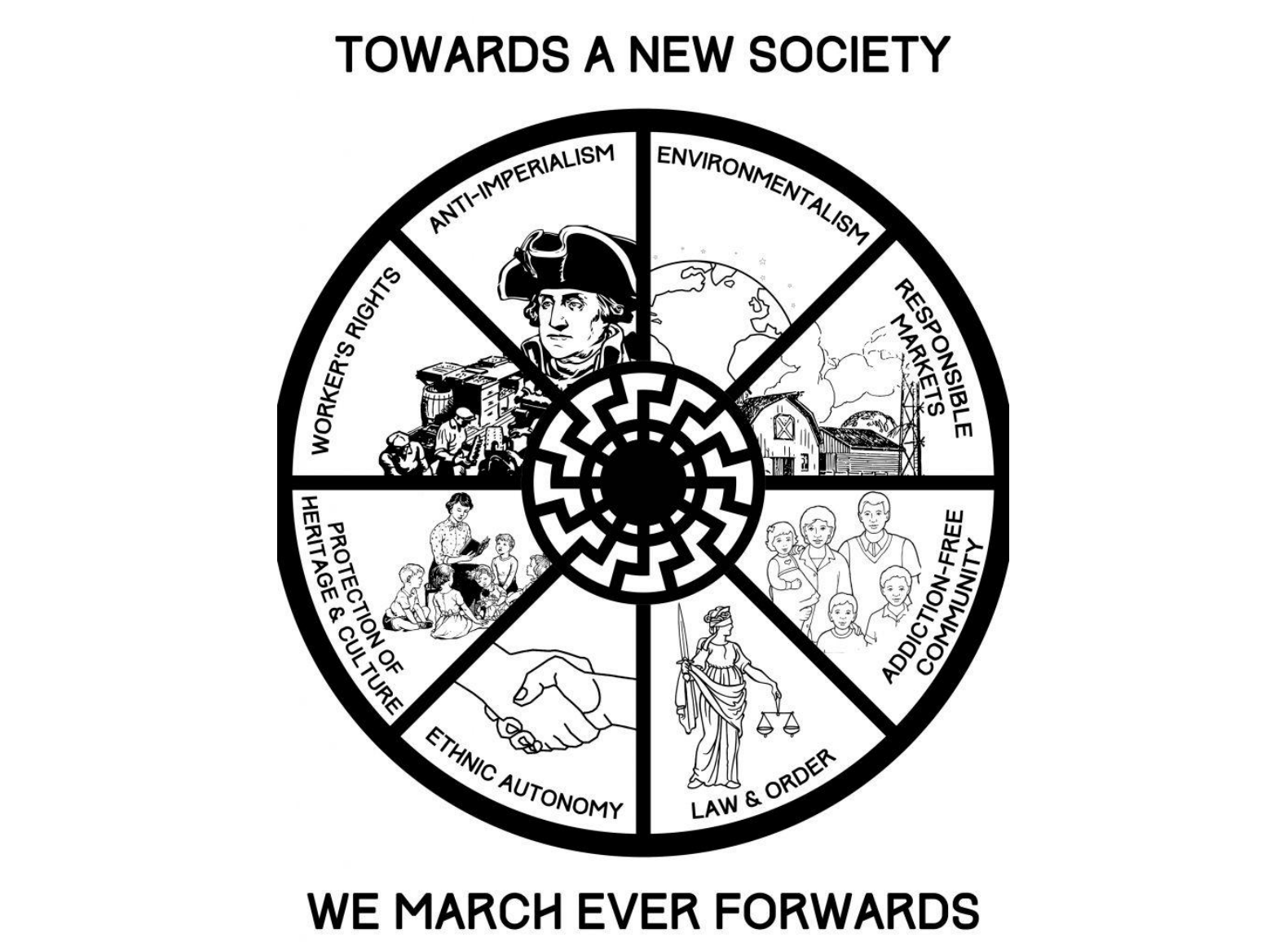 The cover to the alleged shooter’s manifesto, with Nazi occult symbolism front and center. The surrounding tenants are all facets of modern fascism which blends numerous contradictory views.