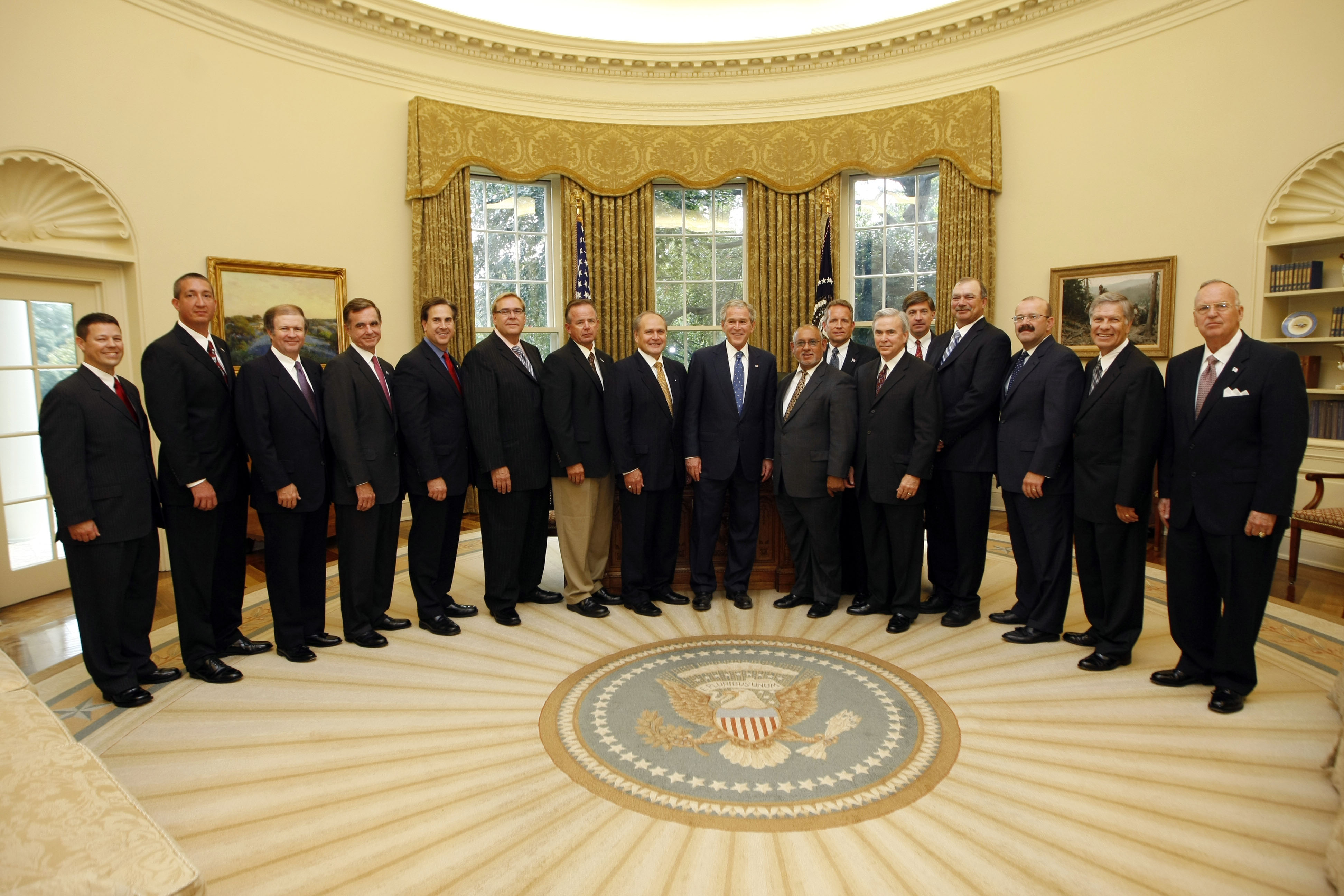 President Bush, center, poses with recipients of the 2008 Secretary of Defense Employer Support Freedom Award, Friday, Sept. 19, 2008, in the Oval Office of the White House in Washington. | AP Photo/Pablo Martinez Monsivais