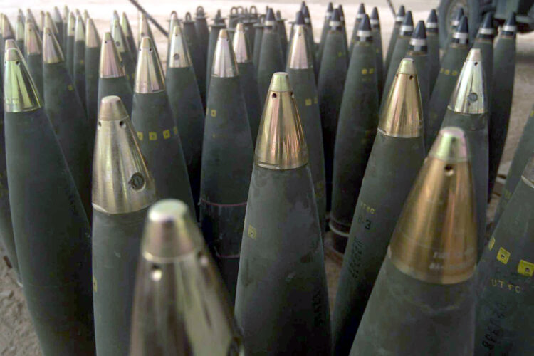 In a row, 155mm howitzer rounds stand ready to firing by Sierra Battery, Battalion Landing Team (BLT) 2/1, 15th Marine Expeditionary Unit (MEU) Special Operations Capable (SOC), in support of Operation IRAQI FREEDOM. (Source: NARA)
