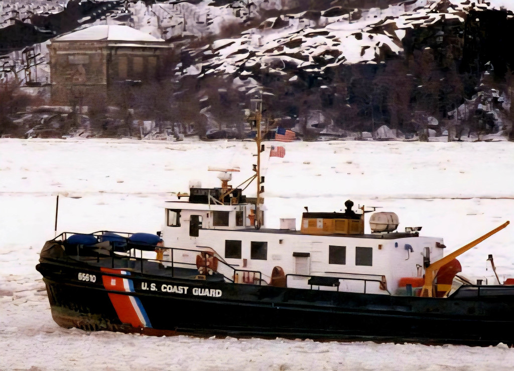 USCGC Hawser is a smaller WYTL-class tugboat (65 feet), built for harbor towing, aid-to-navigation, and light icebreaking in rivers and ports. It pushes through or shatters thin ice (under 1-2 feet) via forward momentum and hull strength.